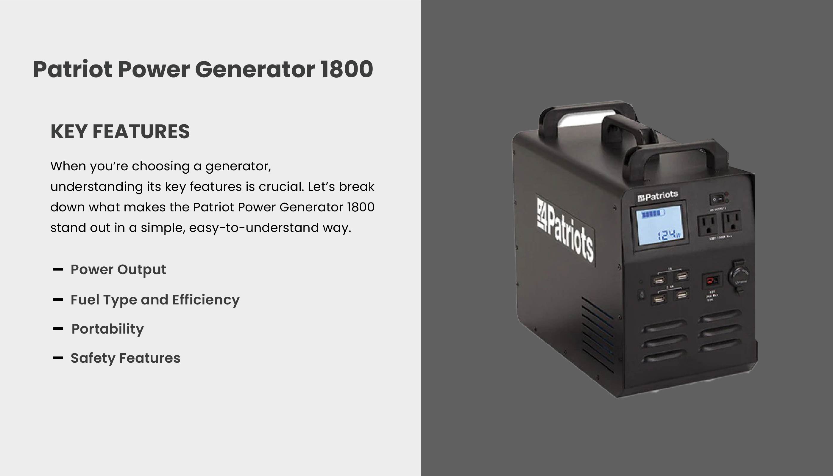 By focusing on these key features, we aim to give you a clear picture of what the Patriot Power Generator 1800 offers and how it can meet your power needs. We’ll explore each feature in detail to help you understand the benefits and see if this generator is the right choice for you.