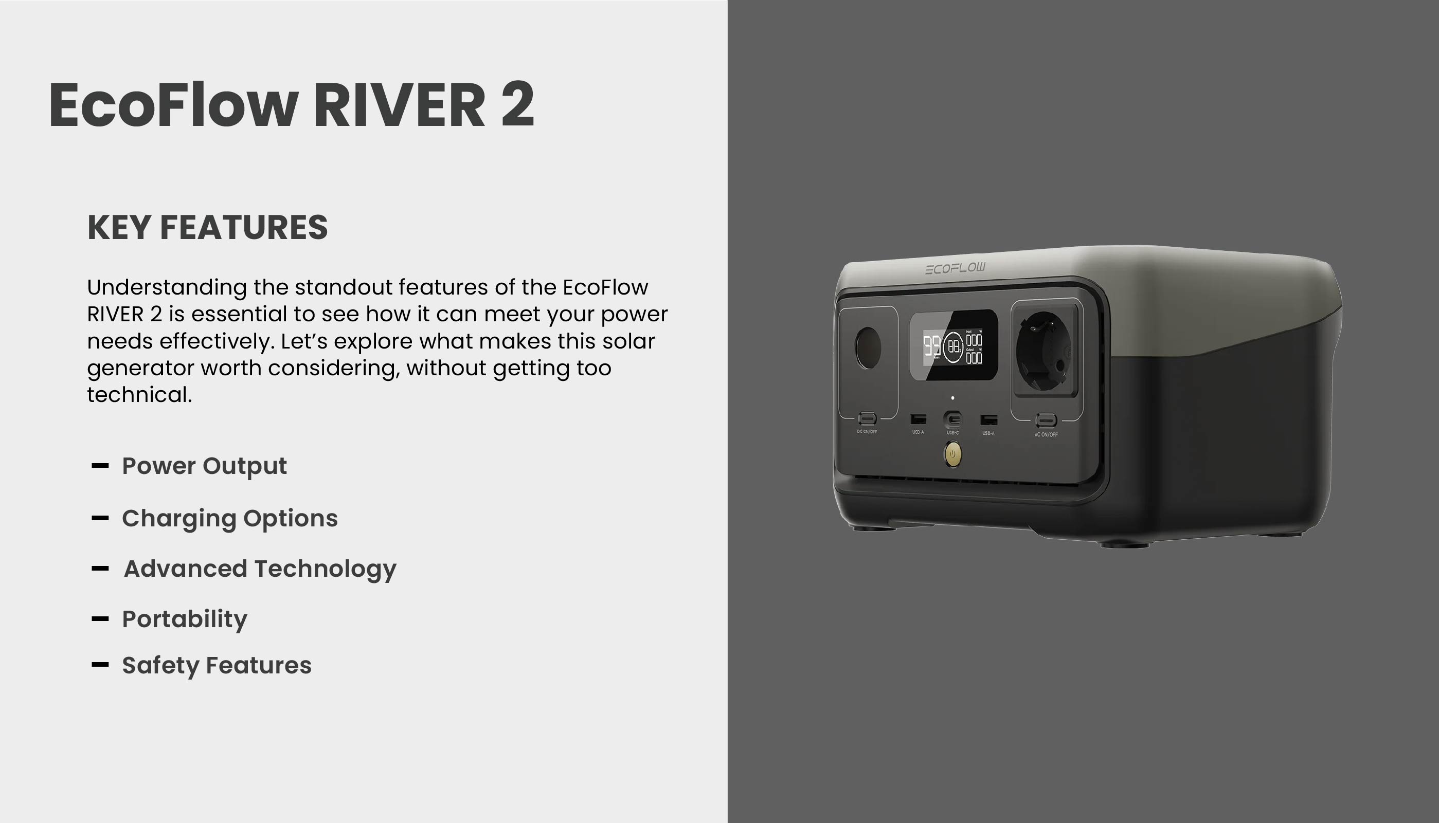 The EcoFlow RIVER 2 stands out as a reliable and versatile portable power station. Its high power output, portability, and advanced safety features make it an excellent choice for a wide range of applications, from outdoor adventures to emergency preparedness.