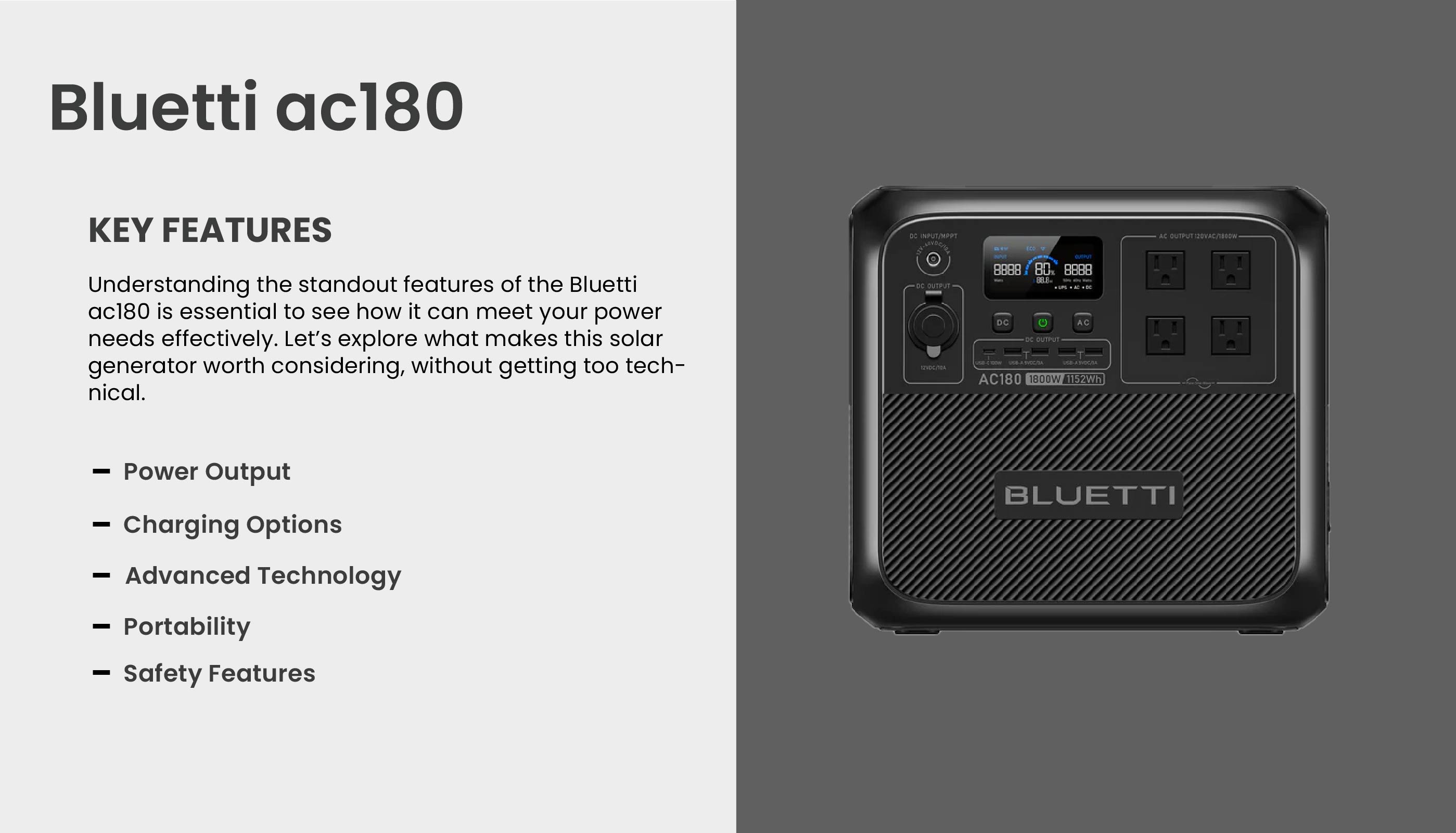 Power Output The Bluetti AC180 is designed to deliver [insert specific wattage here] watts of continuous power, making it suitable for powering a variety of electronic devices and appliances. Whether used for emergency backup at home, outdoor recreational activities, or professional settings, its robust output ensures reliable performance.